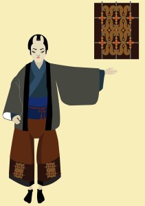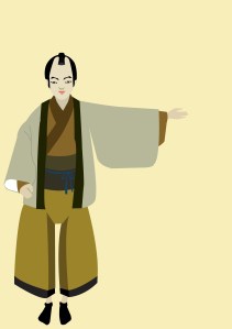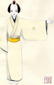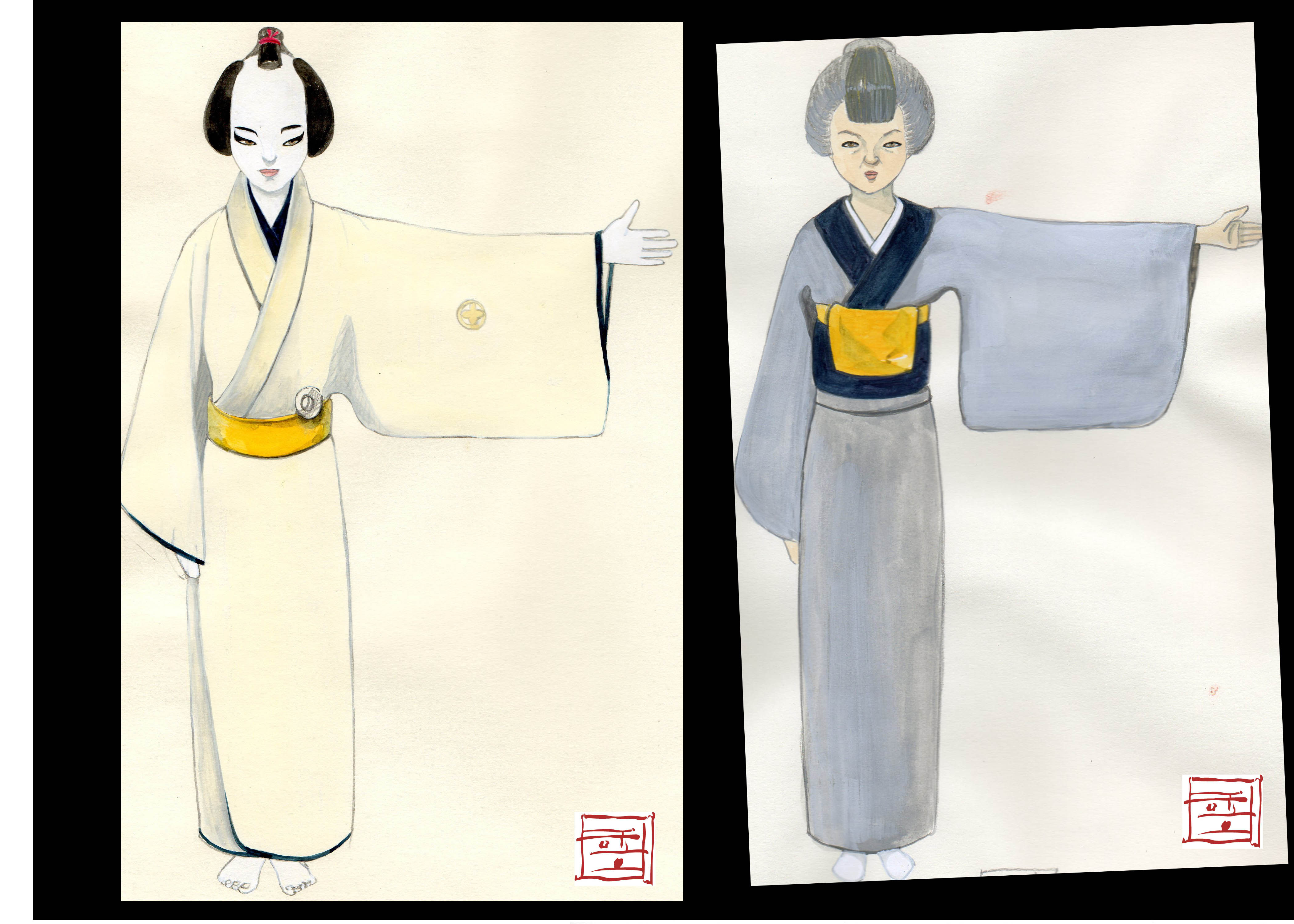 Above: Jane plays “Kampei,” the disgraced retainer, in the traditional Japanese kabuki play Chūshingura. (Concept drawing: Sohhee Han)