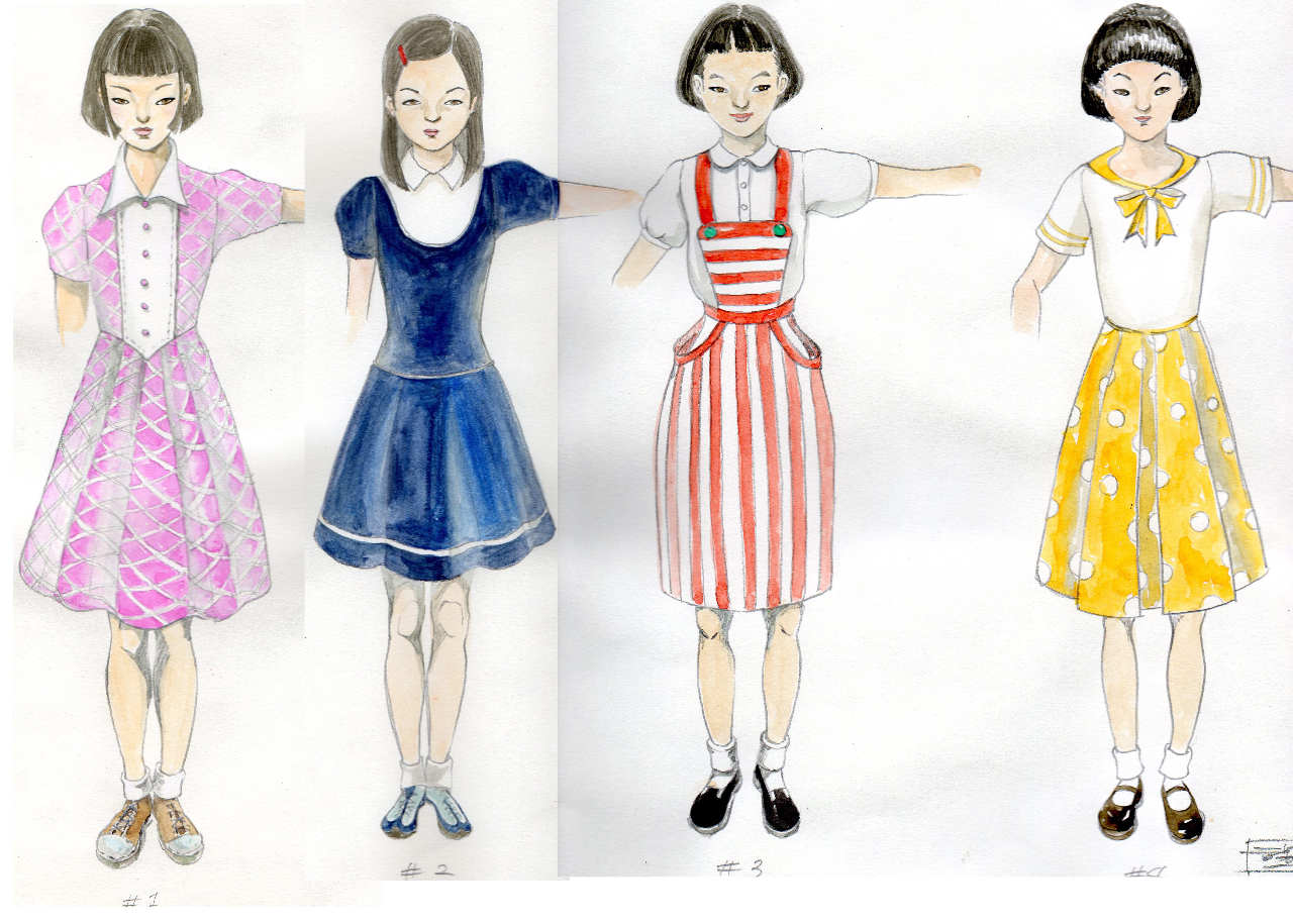 Above: Jane, Michiko, Takayo, and Akiko (left to right) are four Nisei teenagers evacuated from their California homes and interned in camps in the exotic Arkansas Delta. (Concept drawings: Sohhee Han)