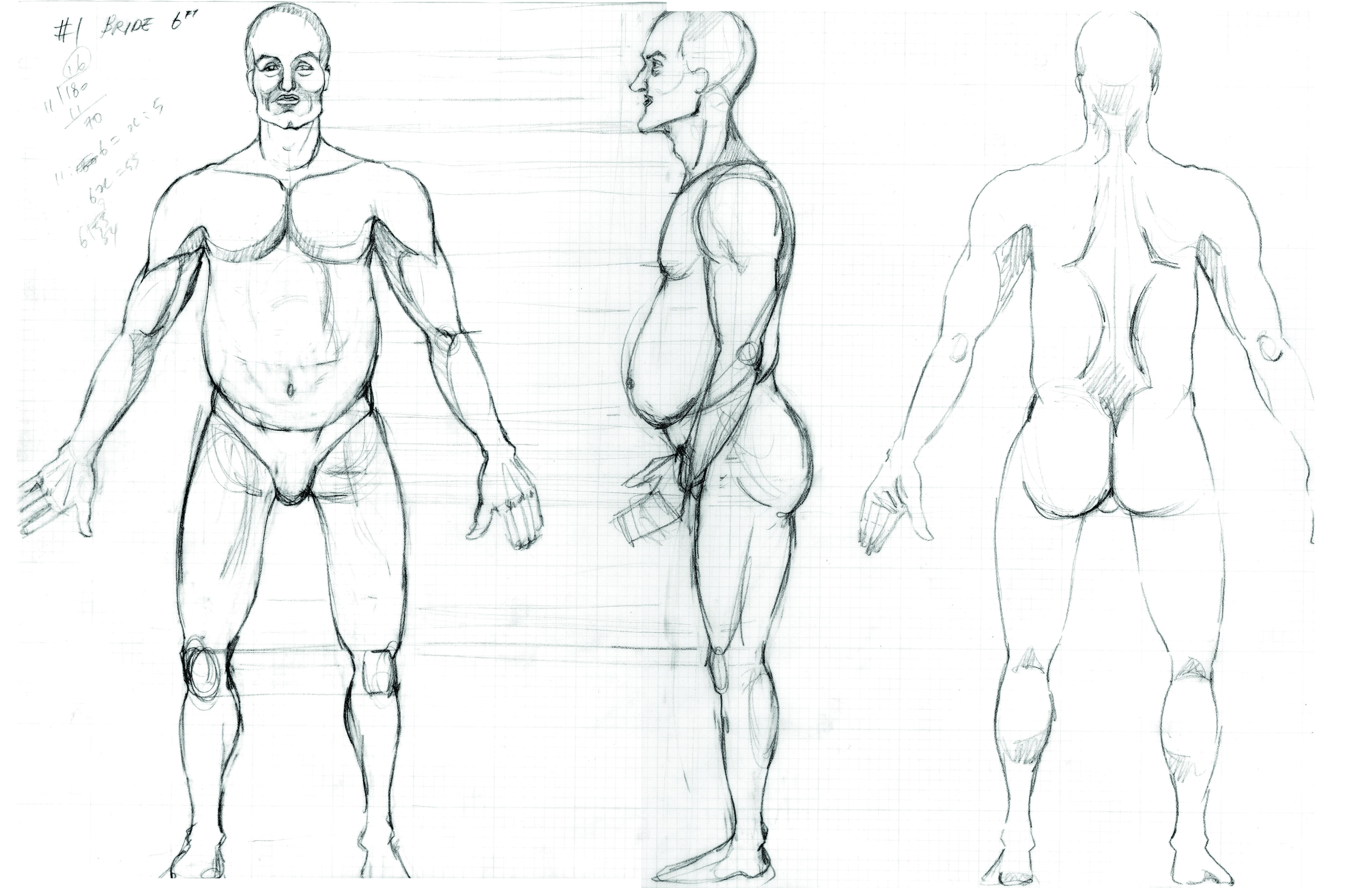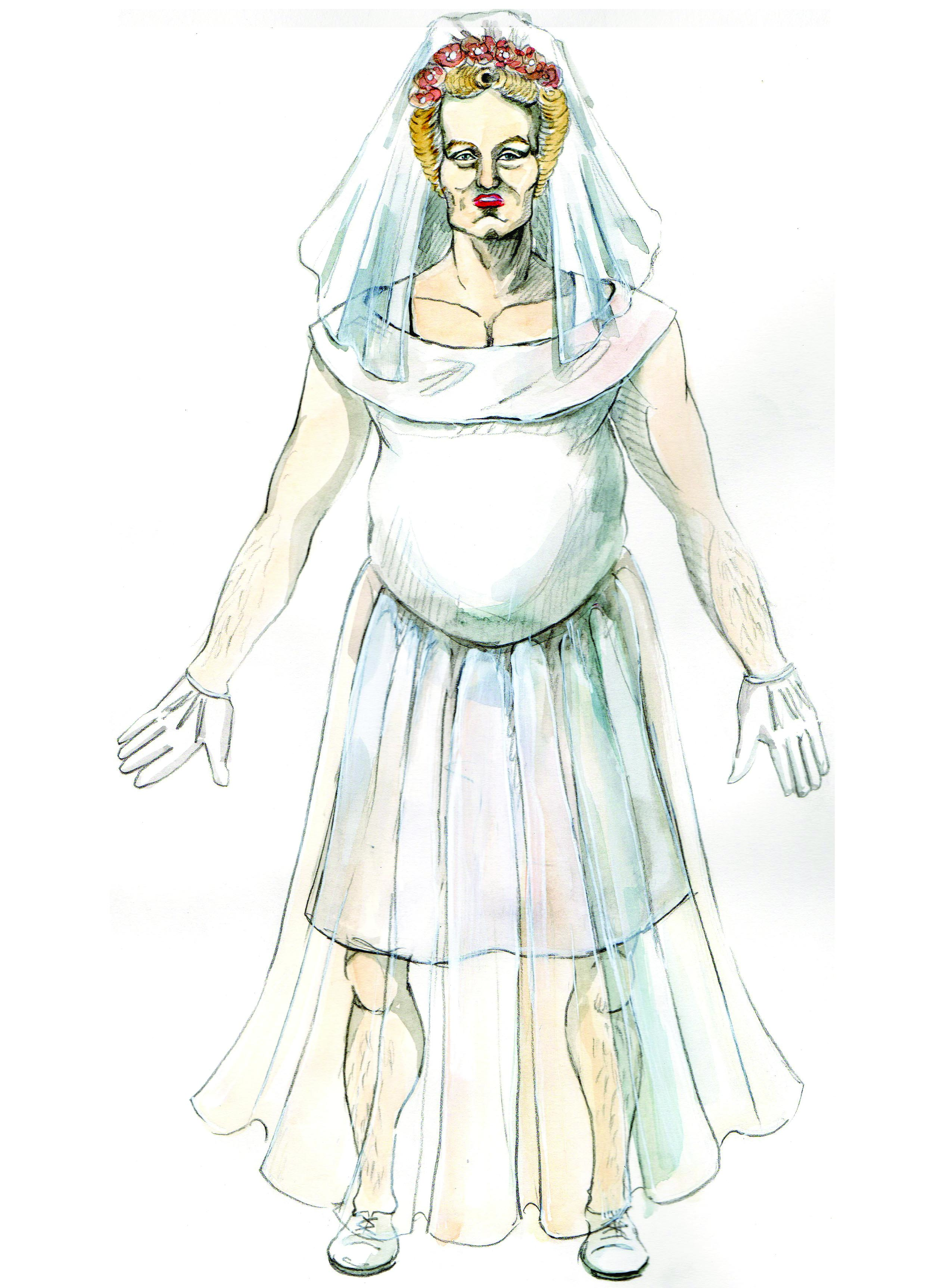 Above: Frank is selected to play the Bride because he could never pass as a woman in real life, and is nearly double the size of the WRA actor selected to play his betrothed. (Concept drawing: Sohhee Han)