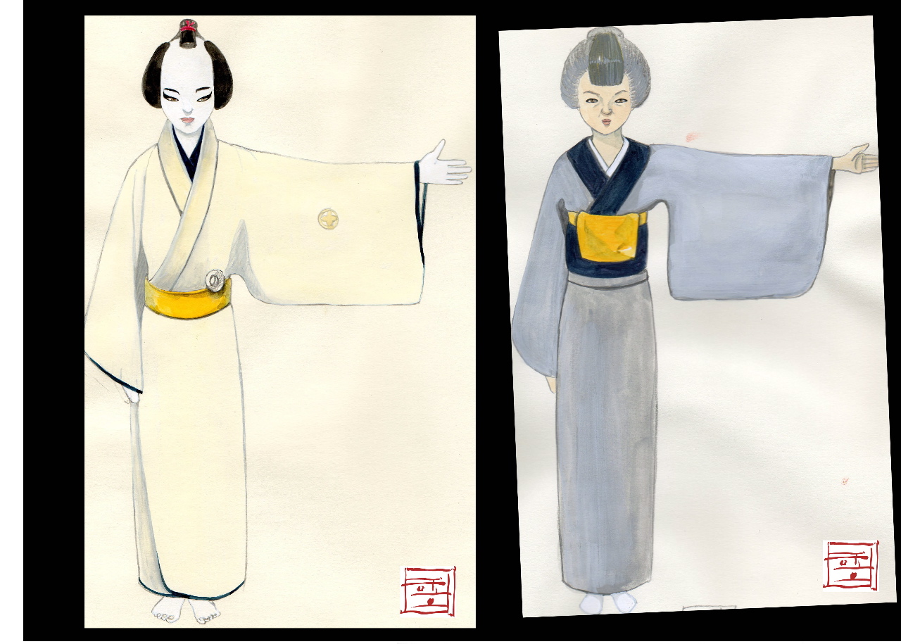Above: Michiko plays “Okaru,” Kampei’s mother-in-law. By the end of the play, Okaru will have lost her husband and son-in-law to violent deaths, and her daughter will be sold into prostitution… (Concept drawing: Sohhee Han)