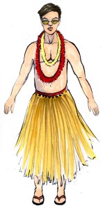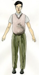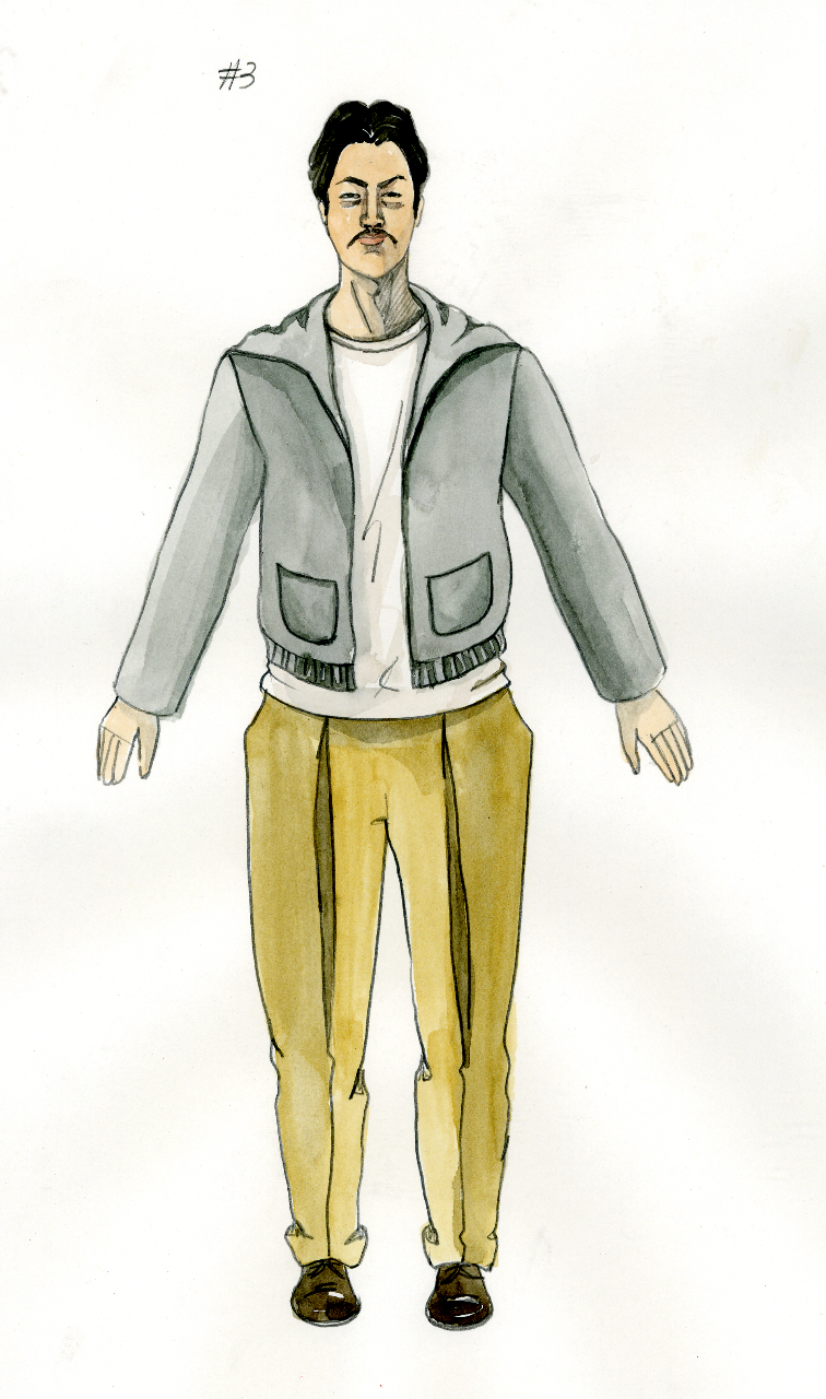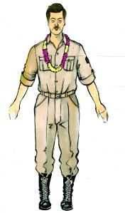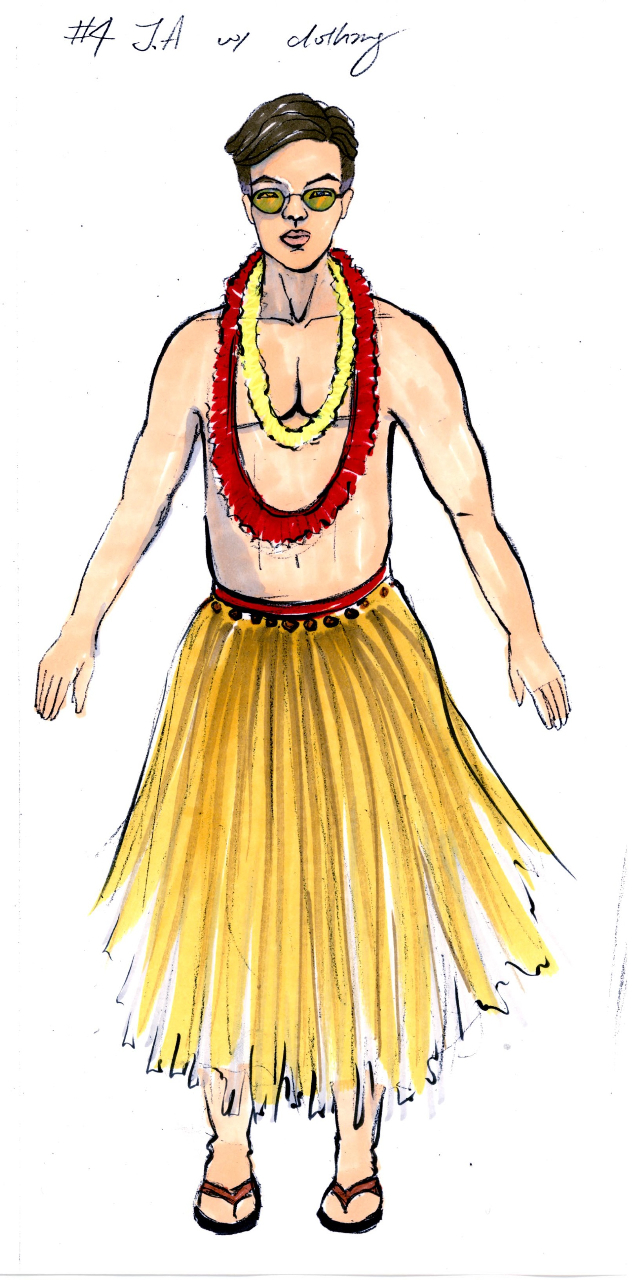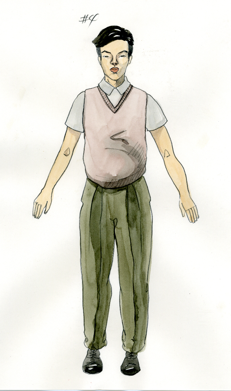 Above: Danny is also a Nisei musician from Hawaii serving in the 442nd. In the costume featured on the right, Danny plays in The Shelby Hawaiians with Kenji. (Concept drawings: Sohhee Han)