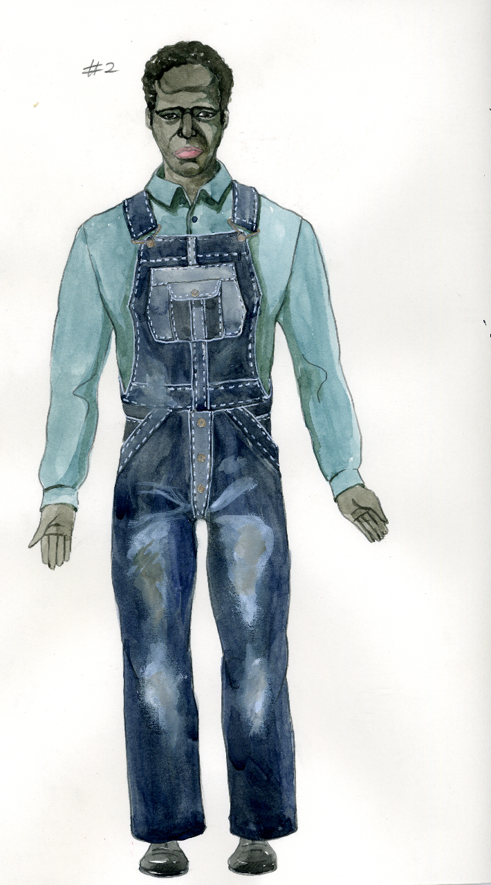 Above: John is an African American laborer who has found day work at the Jerome camp. He is also a talented musician, playing in the Helena Blues with Willie. (Concept drawing: Sohhee Han)